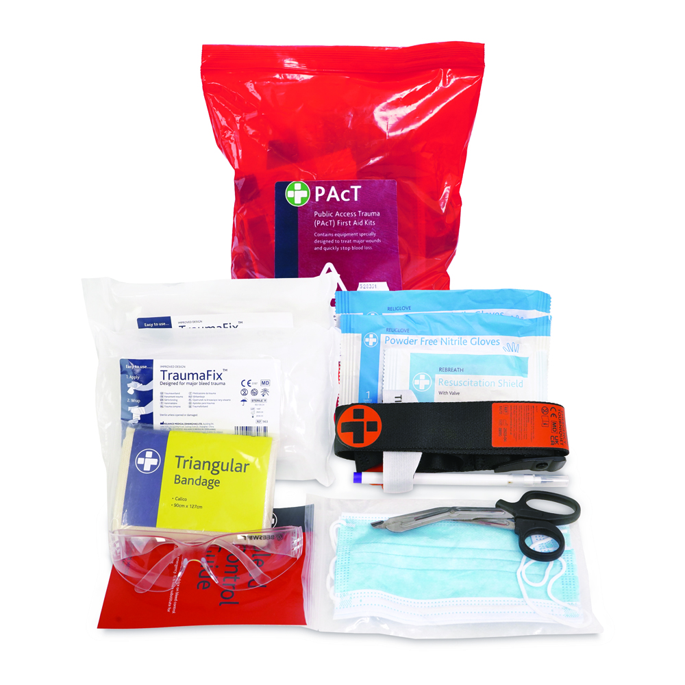 PAcT kits include equipment specially designed to treat major wounds and quickly stop blood loss. The contents were developed in response to national terrorist attacks (including the 2017 Manchester Arena attack) where multiple casualties suffered catastrophic injuries but insufficient equipment was available to stabilise their wounds. PAcT kits are designed for members of the public to access and use quickly and safely by members of the public before Emergency services arrive.